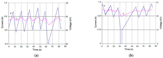 For the voltages shown in Figure 4, it is assumed that the electrodes were dust-free, with a dust resistance of 1012 Ω × cm (highly resistive dust, such ash the ash resulting from the burning of coal). A lower consumption of electricity can be achieved to power each section by employing an intermittent power source (with a decrease in the number of pulses). For all examples, the peak voltage and the corona onset voltage are almost the same. Time is represented on the horizontal axis in Figure 4 and Figure 5.