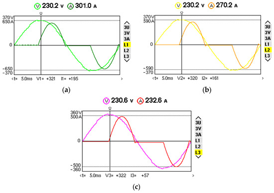 Phase voltages and currents (at one moment in time) for an ESP with three sections on: (a) L1; (b) L2; (c) L3.