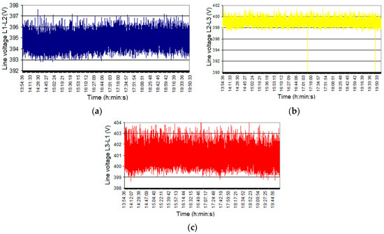 The RMS line voltage values in the primary of a step-up transformer for an ESP with three sections: (a) voltage L1-L2; (b) voltage L2-L3; (c) voltage L3-L1.