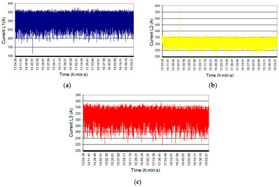 Power sources (high power consumers) supplied at line voltage are employed in ESPs with three sections. To balance the charge of the low-voltage, three-phase network, the three power sources are connected as shown in Figure 17. A power quality analyzer (PQA; CA 8334 B—Chauvin Arnoux) can be used to measure the electrical properties of the low-voltage section [28]. This power quality analyzer contains inputs for measuring current transducers (C1, C2, C3; type AmpFlex, max. 3000 A) and voltage probes (V1, V2, V3). PQA has been used to take the measurements in Figure 18, Figure 19, Figure 20, Figure 21 and Figure 22.
