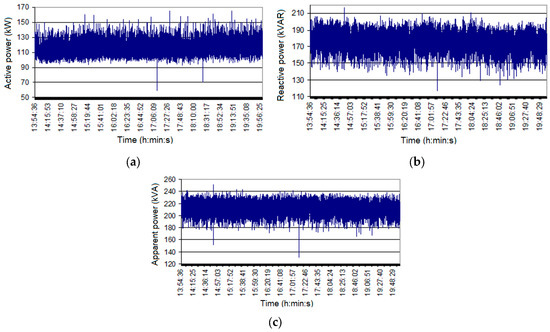 Power measurement: (a) total active power; (b) total reactive power; (c) total apparent power.