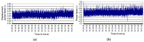 In Figure 22 are presented the power factor for the fundamental (50 Hz, or displacement power factor) and the real power factor (taking into account the currents and voltage harmonics). The real power factor (0.45–0.7) has higher values than the displacement power factor (0.58–0.8). The different values of the power factors are due to the deformation regimes (currents having the most deformed waveforms, Figure 18).