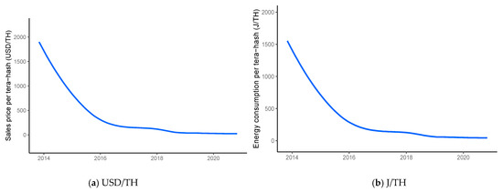 Energy demand and sales price per tera-hash. This figure plots the evolution of ASICs in terms of energy efficiency (a) and sales price (b) per tera-hash computing power (November 2013–June 2020) [43].