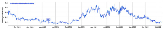 - dee Best, R. Bitcoin (BTC) Mining Profitability Up until 14 November 2022. Available online: https://www.statista.com/statistics/1224262/bitcoin-mining-profitability/ (accessed on 4 January 2023).