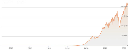 - BitInfoCharts. Bitcoin Hashrate Historical Chart. Available online: https://bitinfocharts.com/comparison/bitcoin-hashrate.html (accessed on 28 July 2022).