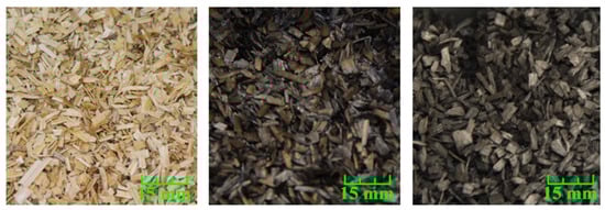 Visual appearance of the sample (left—raw material, middle—residue after the pyrolysis up to 450 °C, and right—residue after the pyrolysis up to 750 °C).