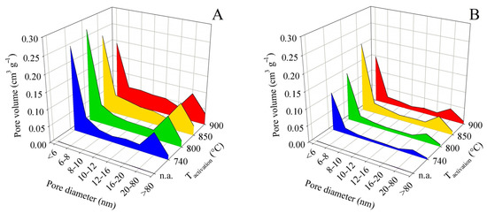 Changes in pore size distribution in dependence on activation conditions applied to the solid residue obtained by pyrolysis up to 850 °C for series (A,B).
