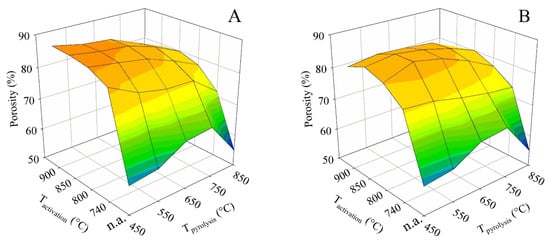 For both contact times (A and B), the porosity trends were similar to those of the specific surface area and the total pore volume. At contact time A, the maximum of 88.4% was likewise achieved for pyrolysis up to 450 °C combined with activations at 850 and 900 °C. In contrast, for contact time B, the maximum of 86.4% was found for pyrolysis up to 550 °C, followed by activations at 800 and 850 °C.