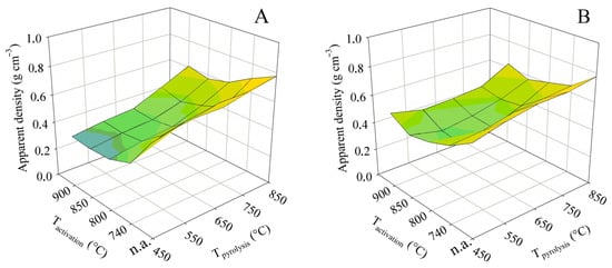 The impact of the pyrolysis and activation conditions on apparent density for series (A,B).