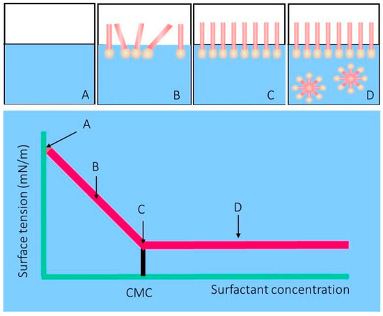 Reduction in surface tension and formation of micelles. A, B, C and D show the sequence of surfactant addition until the critical micelle concentration (CMC) (created by the authors).