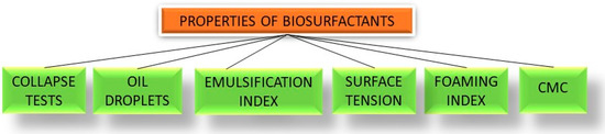 The properties of biosurfactants are determined based on collapse tests, the solubility of oil droplets, surface tension, the emulsification index, the foaming index, and CMC (Figure 2) [6,28].
