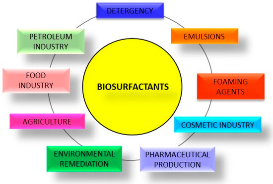 Microbial biosurfactants are innocuous, with low toxicity to animals, larvae, and plants [19]. The amphipathic structure and properties of biosurfactants enable their application as detergents, dispersants, emulsifiers, foaming agents, and solubilizers for use in the oil industry and the environmental field (these applications will be discussed in greater detail in the following sections), as well as in pharmaceuticals, cosmetics, the food industry, agriculture, and the textile industry [19,21,27] (Figure 3). In the food industry, biosurfactants serve as emulsifiers to improve the texture of foods. In cosmetics, green surfactants have low toxicity and, therefore, do not harm human skin cells. In the pharmaceutical field, biosurfactants can be used as an alternative to chemical-based medications, serving mainly as a biofilm anti-adherent agent, impeding the incorporation of pathogens to cell membranes and contributing to the death of cancer cells. Biosurfactants also have a great tendency to interact with biological membranes, exhibiting hemolytic activity [22]. Biosurfactants are also involved in the emulsification and solubilization of dyes and pigments, and adherence to fabrics in the textile industry. These natural compounds can also be used in the fabrication of paints and nanoparticles [22,32].