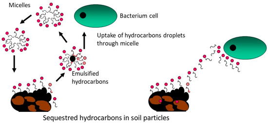 An analysis of dispersion capacity revealed that a biosurfactant with a low CMC was effective; however, the dispersant at a concentration 1.5 times above the CMC was ineffective for biodegradation in marine remediation [63]. Above the optimal concentration, biosurfactants cover the biosurfactant–hydrocarbon complexes, either impeding the access of microorganisms to the hydrocarbons or becoming the substrate used by the microorganisms [64,65].