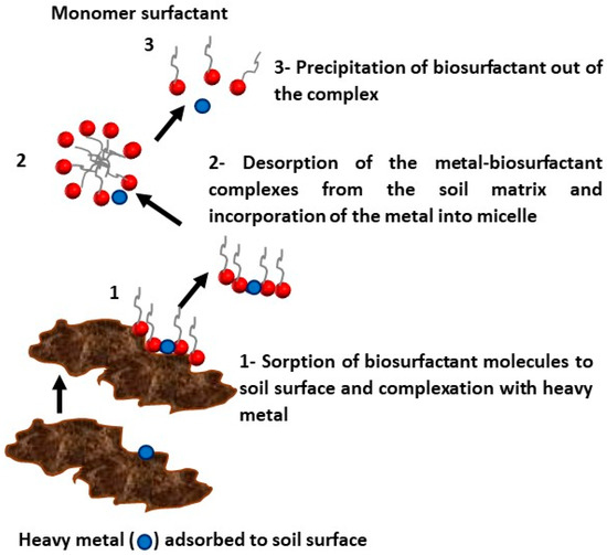 The heavy metals found in soil and sediments are lead (Pb), chrome (Cr), mercury (Hg), zinc (Zn), copper (Cu), nickel (Ni), and cobalt (Co), and must be made to form stable complexes with anionic biosurfactants for precipitation and removal from the soil [22]. Washing with a surfactant solution can be performed for the remediation of soils contaminated by heavy metals. Moreover, the biosurfactant can be reused several times for the cleaning of contaminated soil, also enabling the reuse of the metals in the battery industry [54]. Anionic surfactants form complexes with metals by ionic bonds, which are normally stronger than the bonds between the metal and soil. The interaction between the biosurfactant and the metal is expected to be stronger than the interaction between the metal and the humic acids present in the soil, which act as chelating agents. The reduction in surface tension enables the desorption of the metal–surfactant complex from the soil matrix. The mechanism of removal by ionic surfactants occurs through the sorption of the surfactant to the soil surface, followed by complexation with the metal, detachment of the metal from the soil, and its uptake by micelles of the surfactant, as illustrated in Figure 5. Electrostatic interactions maintain the heavy metal imprisoned in the micelles, enabling subsequent recovery with the use of membrane separation methods [43].
