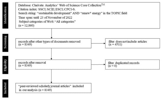 Web of Science database and, particularly, the following indexes were used to collect and compile trustworthy documents: Science Citation Index Expanded (SCI-E), Social Sciences Citation Index (SSCI), Emerging Sources Citation Index (ESCI), and Conference Proceedings Citation Index-Science (CPCI-S). Then, a search engine formula of “TS = sustainable development” AND “renew* energy*” was introduced in the search box of the advanced window for a time period from 1900 to 2022 (extracted on 23 November 2022). As a result, 12,860 documents were retrieved, with the outstanding information of this documents being extracted from WoS using comma-separated value file formats.