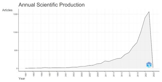 We opted for bibliometric analysis over conventional review approaches in this research because bibliometric techniques are unbiased, objective, analytical, robust, transparent, and valuable in revealing unique but related networks within a field and provide overviews of the domain []. Properly performed bibliometric reviews can greatly enhance the domain by enabling and empowering researchers in obtaining a comprehensive overview, finding the gaps in research, and making critical evaluations of relevant contemporary research questions. Our review is based on 8349 articles from 135 countries published before 23 November 2022 and co-authored by 23,493 authors. Single-authored documents amount to 1040 articles from 906 authors, while the remaining 7309 articles present an average of 3.84 authors per document. These 8349 documents received 181,006 citations and contained 328,799 references. This work is structured as follows. After this introduction, the methodology used is explained. Then, in the third section, the main results are shown. Finally, the conclusions developed are presented, in addition to the main limitations and possible future lines of research.
