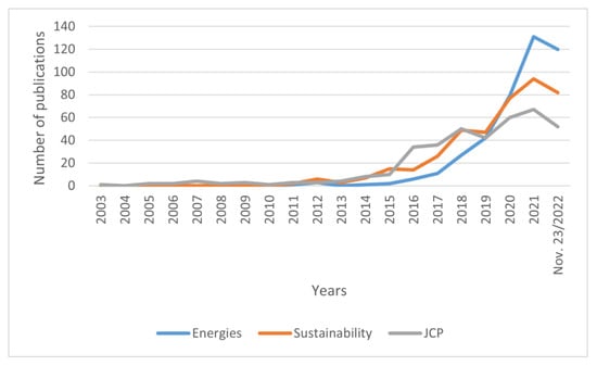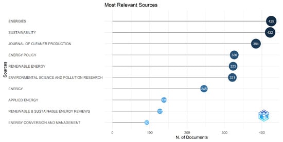As can be seen, the main journals of this list are Energies (425 articles), Sustainability (422 articles), and Journal of Cleaner Production (384 articles). These are currently high-impact journals that focus on energy and environmental, social, and economic sustainability.