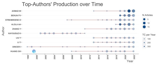 In addition, Figure 5 shows the production over time of some of the most important authors, considering all these indicators. In the same way as observed in Figure 3, most of the scientific productivity in this field from the top 10 authors is concentrated from 2015 onwards.