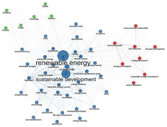 In this regard, Figure 6 and Table 10 present the co-occurrence network of keywords. As showed, the 50 items considered can be classified into three clusters: the first cluster, which has 8 items that treat aspects related to the measurement of the impact of sustainable development and renewable energy; the second cluster, with 36 items, in which different issues linked to the improvement of the sustainability of the development strategies and energy production are included; and the third cluster, with 6 items, that presents keywords related to energy sources created from organic substances.