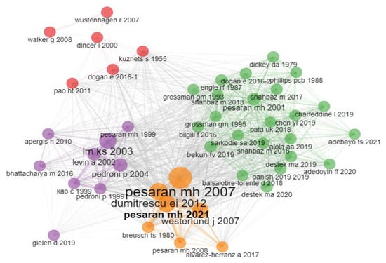 Through the co-citation analysis, four groups were identified that are clearly distinguishable in Figure 7. Thus, it is worth mentioning the contributions of Kuznets and Noris (1955) and Dogan (2016) in the first cluster, Engle (1987) and Bekun (2019) in the second, Im (2003) and Pedroni (2004) in the third, and Pesaran (2007) and Dumitrescu (2012) in the fourth cluster.