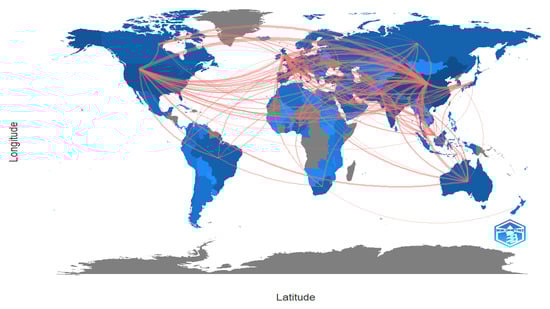 Figure 8 presents some key collaboration between countries, establishing a minimum edges threshold of eight. As can be clearly seen, the main cooperation agreements are managed by universities located in China, the United Kingdom, and the United States of America, which build ties to their peers throughout different countries in the world. In addition, Latin American and African countries seem to share a limited number of international cooperation agreements. Table 12 shows in detail the 40 country pairs with the highest frequency of collaboration, China being one of the most collaborative countries in the fields under study that actively cooperates with universities located in countries all around the world, such as Pakistan, the United States of America, the United Kingdom, Turkey, Canada, and Australia, among others.