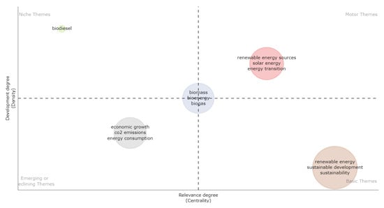 Based on these data, it could be interpreted that China has the claim to lead scientific research in the fields of energy transition and sustainable development. In this sense, it would be interesting to extend the research to determine whether the strategies, regulations, and actions of this country are linked in the same terms to the achievement of these objectives. As was observed in the ranking of the most important countries, the United States of America and the United Kingdom are positioned as the second and third most important countries, although far behind the figures achieved by China. Finally, in Figure 9 the thematic map is shown, in which four themes are distinguished that reflect the most relevant issues in the field through the analysis of their internal and external relationships. Based on this, we established that renewable energy sources, solar energy, and energy transition are motor themes, which means they significantly contribute to the development of the discipline. Furthermore, economic growth, CO2 emissions, and energy consumption are identified as emerging fields in this area which need to be developed.