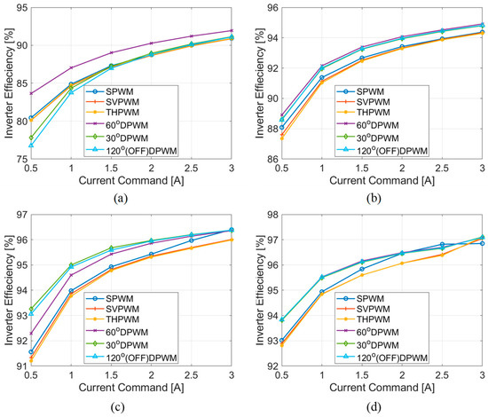 - Wu, Y.; Shafi, M.; Knight, A.; McMahon, R. Comparison of the Effects of Continuous and Discontinuous PWM Schemes on Power Losses of Voltage-Sourced Inverters for Induction Motor Drives. IEEE Trans. Pow. Electron. 2011, 26, 182–191. [Google Scholar] [CrossRef]