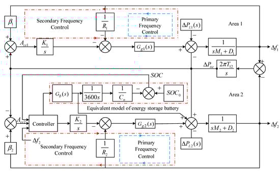 Frequency control model of the two-zone system with energy storage devices.