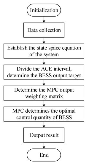 Firstly, we need to collect model data of AGC system in grid, model data of the BESS and load disturbance data before we use MPC. Secondly the state space expression of the system is established according to the model data of the BESS and load disturbance data. Finally, the optimal control variables of BESS are obtained through the prediction model, rolling optimization, and feedback correction, which can balance the SOC recovery demand of BESS and the demand of frequency control to grid.