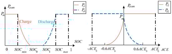 In Figure 4, when , the SOC state is better and does not require self-recovery. When or , the SOC state is poor and needs self-recovery. The self-recovery power is determined by considering SOC and ACE signals comprehensively. When or , the SOC state is worst and stay in a state of emergency. BESS will stop participating in frequency control to enter in self-recover at the maximum power.