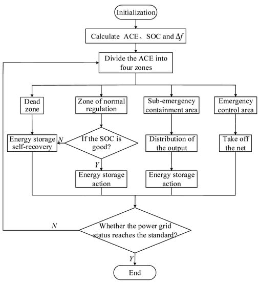 By formulating a reasonable output control strategy for BESSs, the frequency control effect of the system improves, and the SOC maintains a healthy state. The ACE signal’s size is closely related to the output size of the BESS. According to the absolute value of ACE, it can be divided into several control intervals, including dead zone , normal state zone , sub-emergency state zone , and emergency state zone (>). Combined with the capacity limit and SOC of the battery, the output and self-recovery strategies of the BESS can be determined based on meeting the demands of frequency control while using the coordinated operation of thermal power units and BESSs.