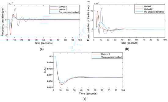 - In Figure 7a,b, and Table 3, we compare the proposed method with Method 1(without BESS) and Method 2 (PI). From the results, we obtained the maximum values and root mean square values of system frequency deviation, the maximum values and root mean square values of tie-line power deviation, and the adjustment time, all of which decreased with our proposed method and Method 2. The overshoot of the proposed scheme is the smallest, indicating that the dynamic stability is superior to the other two methods.