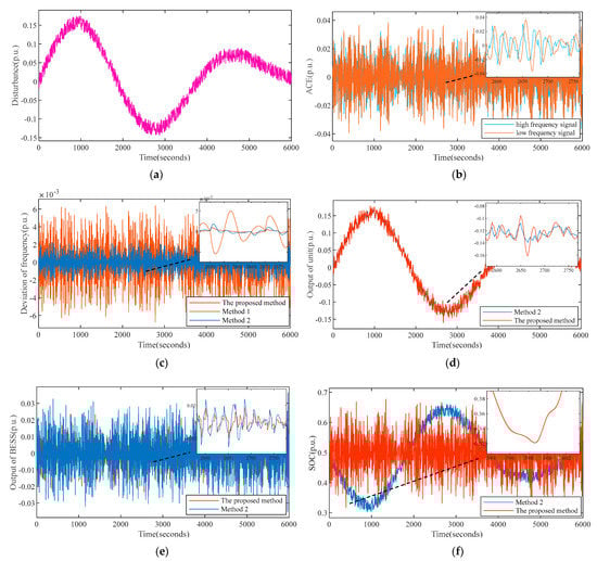- In Figure 8f, the SOC fluctuation range of our strategy is between 0.3 and 0.7, the state-keeping effect is better, and the burden of BESS is reduced. In addition, it can be seen that when SOC is lower than 0.3, the SOC falling speed is significantly reduced and the rising speed is increased. It is proven that changing the component of high frequency for energy storage in real time is beneficial to maintain SOC state. The ACE signal’s high-frequency component has the characteristics of zero mean value and small amplitude. Assuming the ACE signal’s high-frequency component by the BESS has its advantages of fast response speed and maintaining SOC.