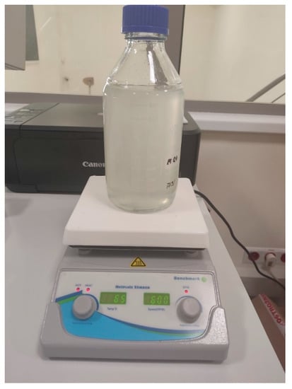 In addition, the used magnetic stirrer has a heating function that supports the dissolving process. In this study, oil was heated to 650 °C while being stirred with a magnetic stirrer at a speed of 600 rpm. Triton X, after the first mixing, became cloudy, and after the next mixing, the solution became clear.