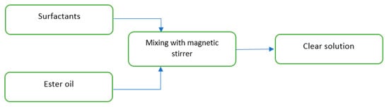 In the first step, using a magnetic stirrer, oil samples of ester oil and surfactants were mixed, creating solutions (Figure 2). A magnetic stirrer accelerates the dissolution of selected mixtures in oil.