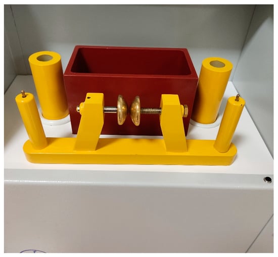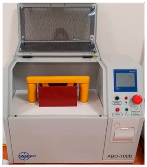 The appliance for testing breakdown voltage is shown in Figure 4. Device model: ZWARpol AB0-80, serial number: 484, IEC 156 configuration (according to IEC 60156 standard) [,,]. Its apparent power is 220 VA, the maximum secondary voltage is 2 × 50 kV, and the test voltage is 2 × 60 kV.