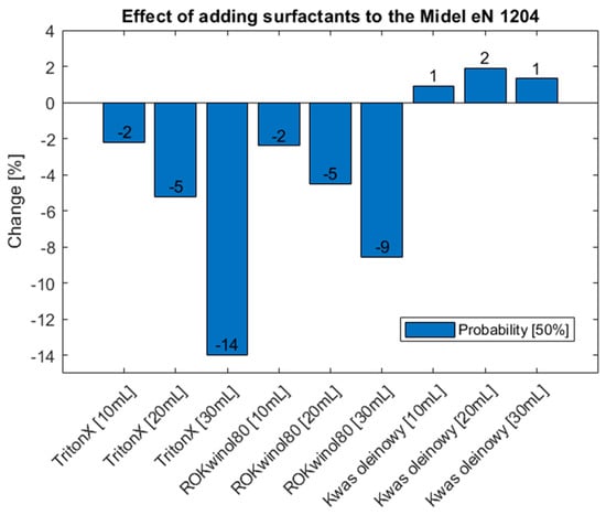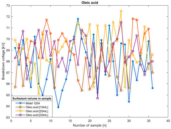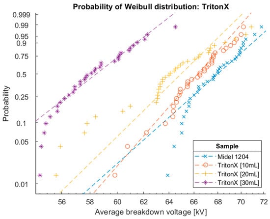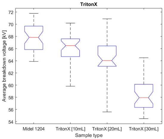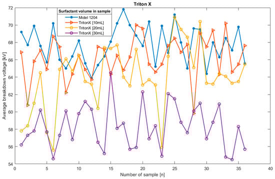 Figure 6 shows line plots for Triton X surfactant. The authors observed that, with the increase in the surfactant in the base sample, the average breakdown voltage decreases, which might suggest that this surfactant worsens the properties of the MIDEL eN 1204 in terms of breakdown voltage.
