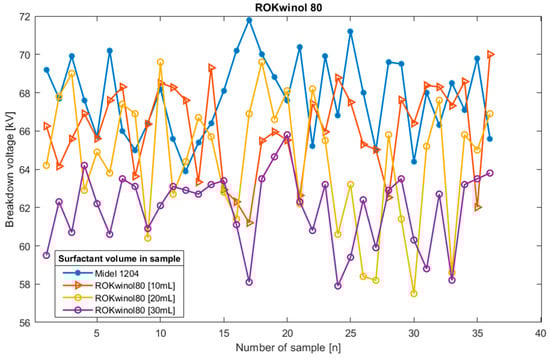 Figure 7, which presents the breakdown voltage of surfactant ROKwino l80, indicates that the solutions of this surfactant worsen the breakdown voltage of oil compared to the base sample.