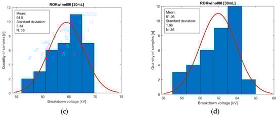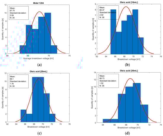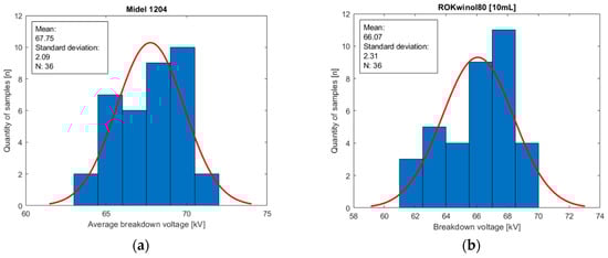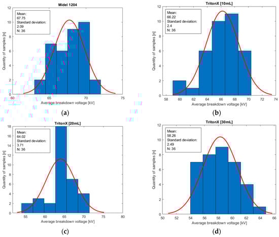 For each sample, histograms with applied normal distributions were made. On the histograms, we displayed the mean of the population and its standard deviation. Each group consists of 36 tests of the average breakdown voltage.