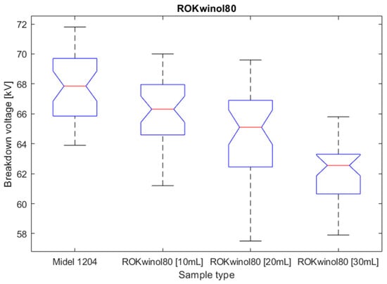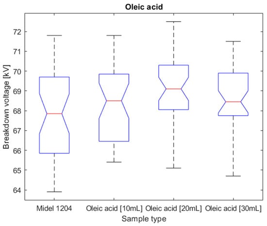 Analyzing medians and notches in the box plot, we can roughly estimate that there are significant differences in the medians for Triton X and ROKwino l80 solutions compared to the base sample. However, looking at the oleic acid populations, the notches of the boxes are close to the base sample and the medians are higher, which could suggest that this solution does not worsen the breakdown voltage.