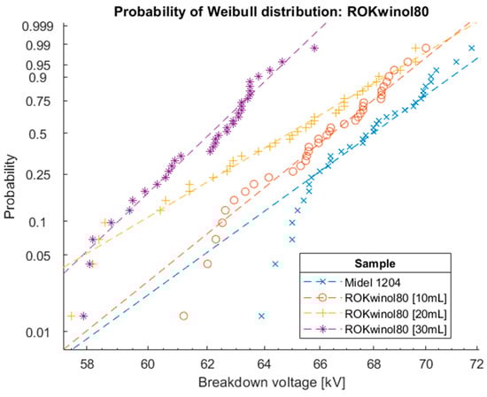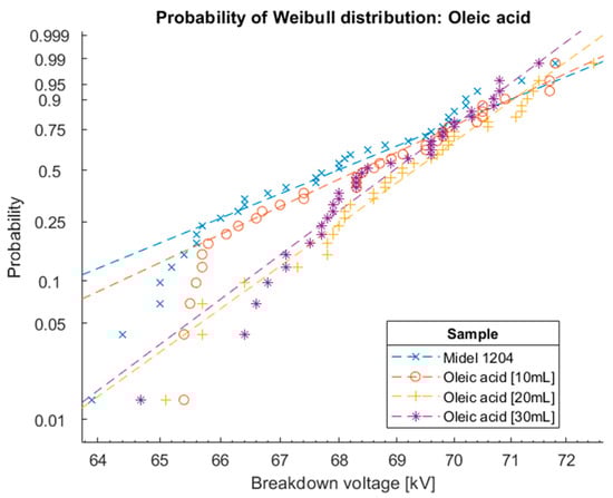Except at 2% concentrations, oleic acid from normal distributions is rejected. This could be explained by the way the algorithm works. Because this population has the highest kurtosis and skewness values, the authors reject the null hypothesis that it belongs to the normal distribution. Table 5 displays the results belonging to the Weibull distribution. Based on the results obtained, it was confirmed that the samples allow for the analysis of characteristic values of breakdown voltage using the Weibull distribution. In most populations, the null hypothesis for normal distribution was rejected. Rejection is caused, among other things, by skewness in distributions. Based on the empirical measurements and results reported in the literature [,], the Gauss distribution does not accurately represent a model of breakdown voltage.