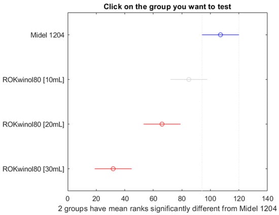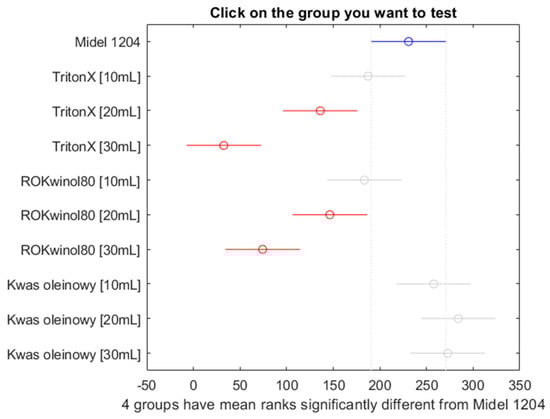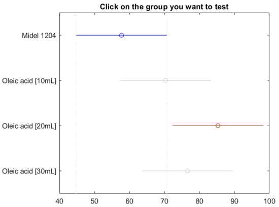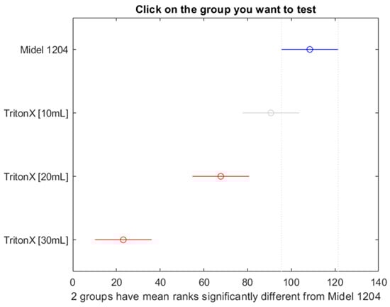 For this reason, high values of probability should be used. The percentage change for each of the surfactants is shown in Figure 24. Analyzing this graph, we can see that the surfactant oleic acid achieves better results with a probability of 50%; other populations of this surfactant have negative values, ruling them out as surfactants with a positive influence on MIDEL eN 1204. Non-parametric testing was also carried out, including the Kruskal–Wallis test. Figure 25 shows the post hoc results for all samples of this test. This test does not require that the population be normally distributed.