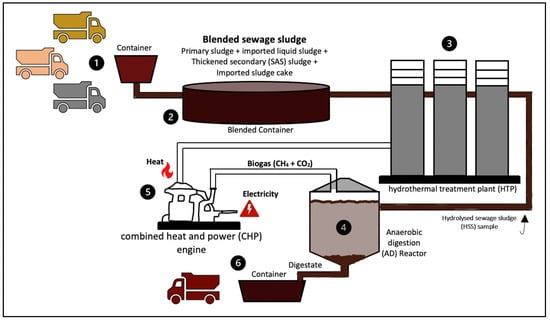 The inoculum used for the batch bio-H2 potential (BHP) tests was prepared from digestate samples collected from an anaerobic digester processing sewage sludge at Yorkshire Water’s Esholt Wastewater Treatment Works (WWTW), Bradford, United Kingdom (UK)—see Step 4 in Figure 2, showing the steps conducted at Esholt WWTW for sewage sludge processing. Digestate samples were incubated at 37 °C and fed with hydrolysed sewage sludge (HSS) once a week to keep the microorganisms active. The hydrothermal pre-treatment process to produce HSS is illustrated in Step 3—Figure 2. Digestate and HSS samples were both collected at Esholt WWTW. D-glucose powder (Sigma-Aldrich, Gillingham, UK; ≥99.5% purity) was used as substrate for BHP tests to assess the quality and suitability of the inoculum for hydrogen gas production.