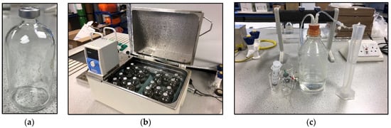 BHP equipment and material. (a) Wheaton bottle (160 mL), (b) water bath 37 °C, (c) water-displacement device.