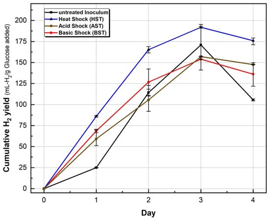Cumulative hydrogen production for untreated and treated inoculum during 5-day BHP tests (average value of triplicate with max/min bar).