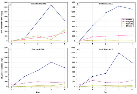 VFA accumulation during 5-day BHP tests: (a) untreated inoculum, (b) HST, (c) AST and (d) BST.