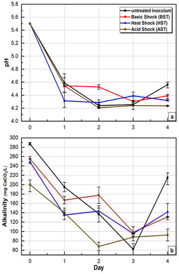 In this study, the initial pH was adjusted to 5.5 for both control (untreated inoculum) and tests (treated inoculum), which is within the recommended pH level mentioned earlier. The production of VFA by Day 1 resulted in a decline in pH in the control and test reactors (Figure 6a) and HST, which had the highest VFA production at Day 1 (829 mg/L) also had the lowest pH value, 4.3, on Day 1. However, the VFA composition of HST was predominantly butyrate and acetate and, hence, a higher hydrogen yield was obtained from the same (see Section 3.1). Nonetheless, the final pH for the control and all tests was between 4.2 and 4.6. Similarly, a final pH of 4.6 was reported by [44] for batch BHP tests.
