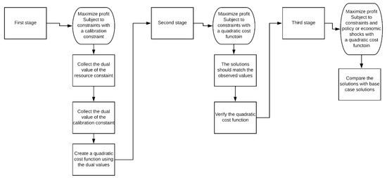 The standard PMP approach involves three stages to calibrate a linear cost function (1st stage), thereby obtaining an upward sloping supply (marginal cost) function (2nd stage), and a 3rd stage where the calibrated model is used to analyze policy. This is illustrated in Figure 1. The optimization problem is defined as: