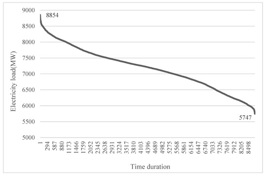 Electricity demand in Alberta has increased over the past several years, although load has remained relatively stable within a given year because more than half of the demand comes from industrial and commercial activities. Specifically, about one-third of the total Alberta internal load (AIL) is from the industrial sector; one-fifth comes from commercial activities and the remainder is contributed by residential and farm customers [4]. A load duration curve rearranges the hourly load (demand) throughout a year from highest to lowest, with the lowest load to be met by baseload generators—thermal assets, such as coal, nuclear or combined-cycle gas turbines (CCGT), or a hydroelectric facility with reservoir. For our modelling, we estimate hourly demand by adding up hourly generation from different assets and net imports. The available hourly data on AIL are on average greater than our estimated hourly supply by adding up generation by different assets, including net imports. We consider this difference to be primarily driven by behind the fence load and industrial self-generation. Alberta’s load duration curve for 2019 is provided in Figure 3; the highest load is 8854 MW, while the baseload is 5747 MW. In our study, we ignore any generation used to self-supply behind-the-fence load and consider only the system load that is external to the generating assets [33]. The Alberta internal load represents the system load plus load served by on-site generating units, including those within an industrial system and the City of Medicine Hat.
