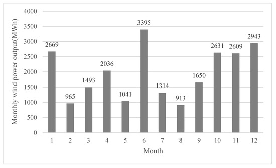 Monthly wind power output from an ENERCON E-126 7.58 MW wind turbine in Pincher Creek, 2019.